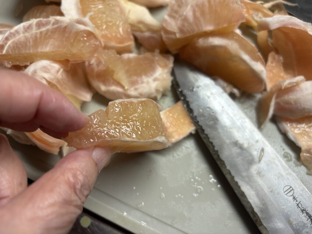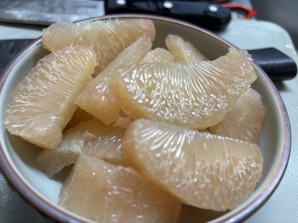 この大きさの柑橘類は(例えばは八朔とかでも)、面倒かもしれないけど全部房の部分んを外して、