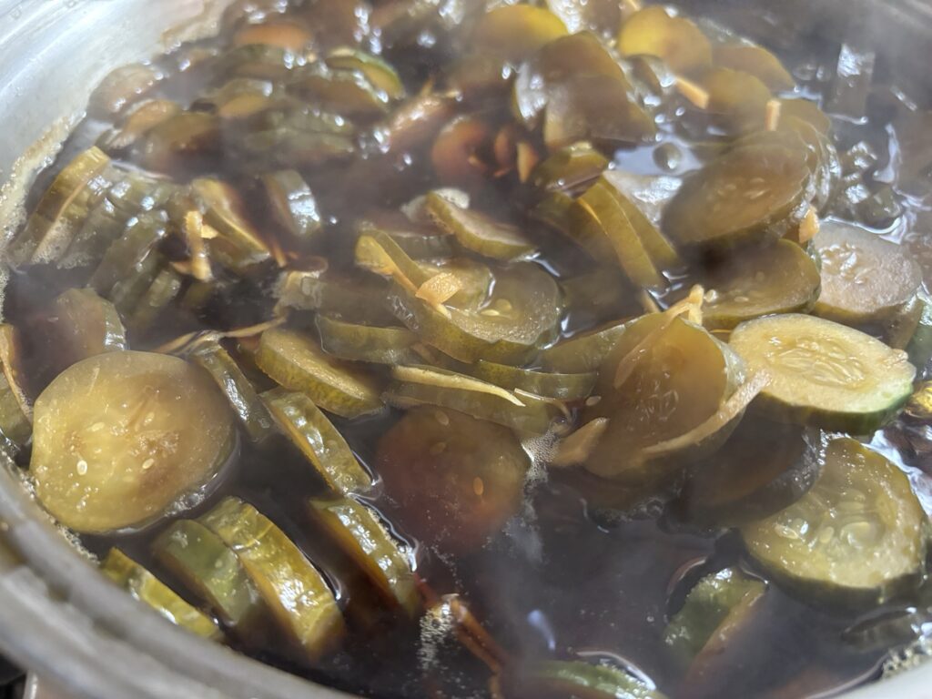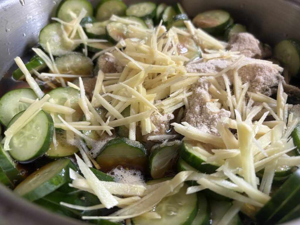 きゅうりのキューちゃん漬けはきゅうりの塩揉みをした後、出汁だけを煮て漬け込む方法と(ぽりぽりに仕上がる)