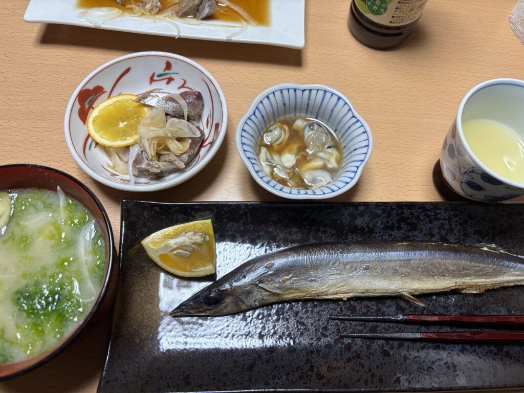 鰹のタタキ、酢牡蠣、アオサの味噌汁、秋刀魚の塩焼き。