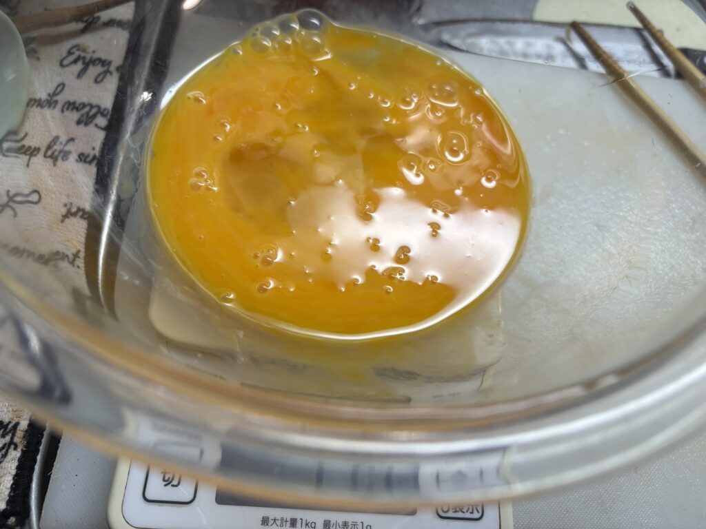 卵2個に、バナナ1本フォークで潰して入れ、蜂蜜25gを入れて、米油20g入れます。