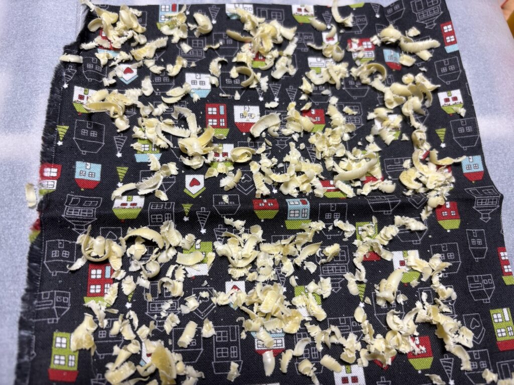 おろした蜜蝋は好きな形に切った布に上にパラパラとおきます。