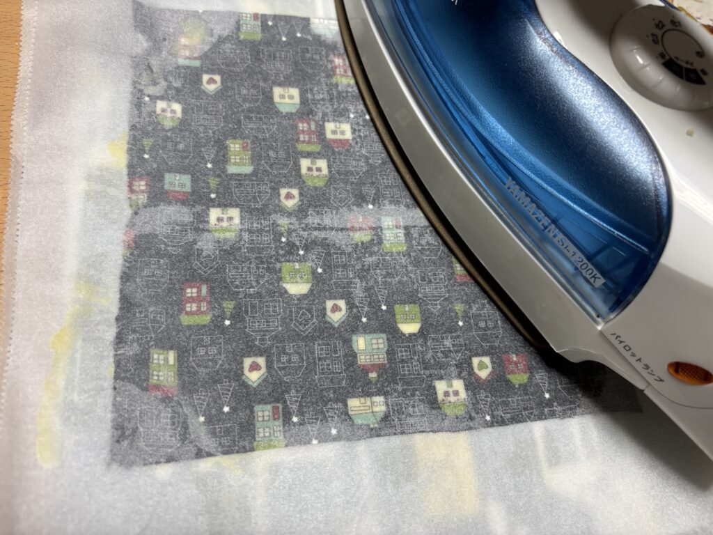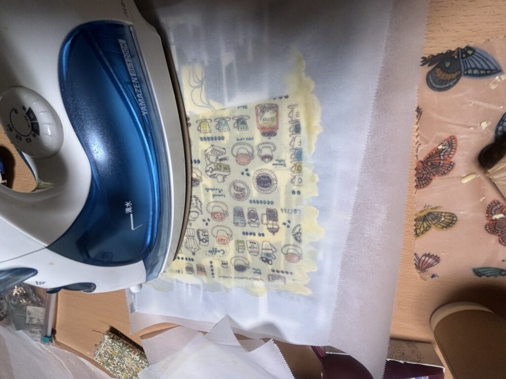 クッキングシートの上に布と蜜蝋を置いて、その上にまたクッキングシートを置いてアイロンを低温にしてかけます。