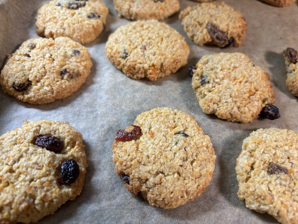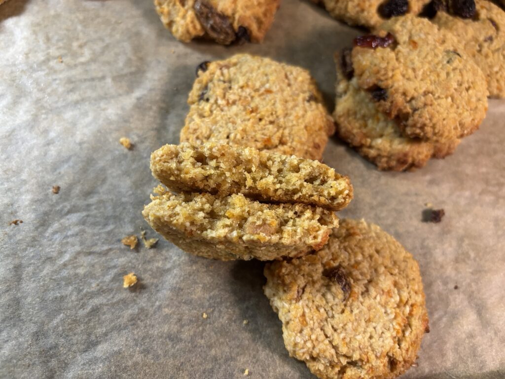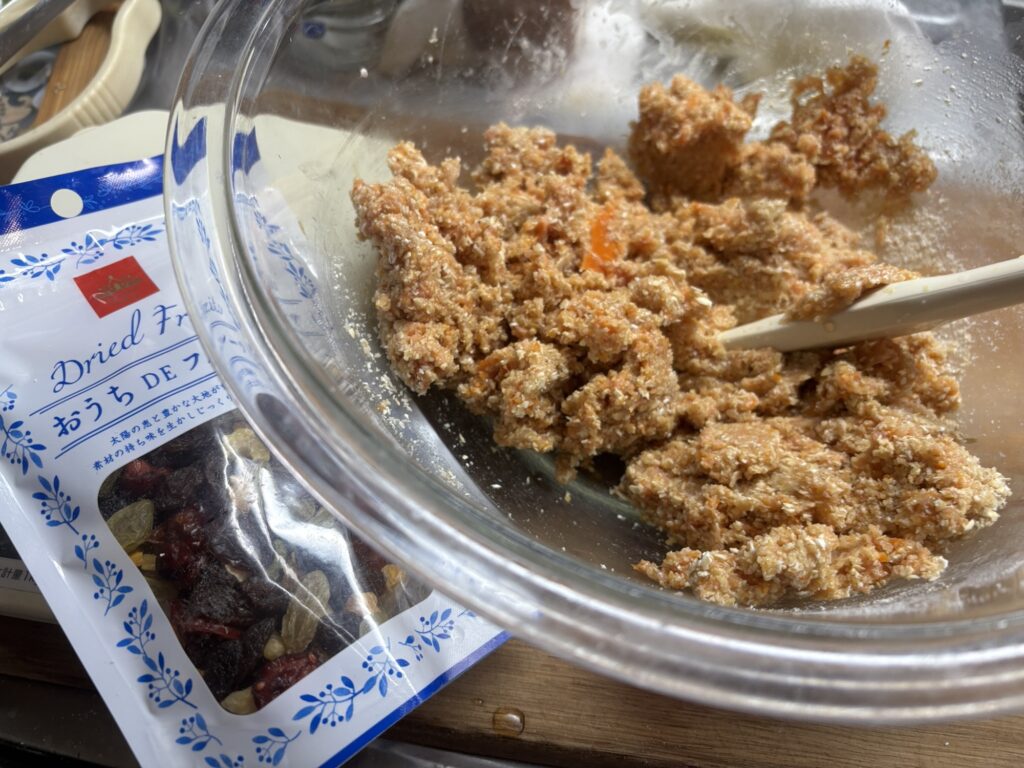 ミックスドライフルーツがあったのでそれも混ぜて、170℃で15分焼いたもの。