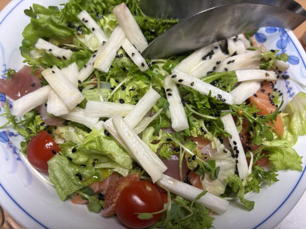 そしてサラダ。いつもの刺身ちょっと乗せ。