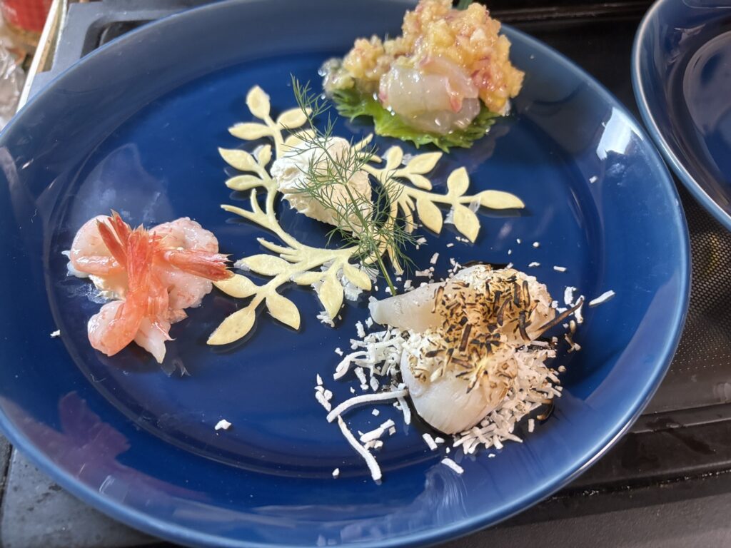 前菜風の、甘エビのわさびクリーム、ホタテのココナッツ焼き、鯛のカルパッチョ。
