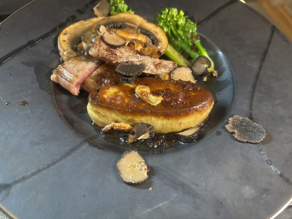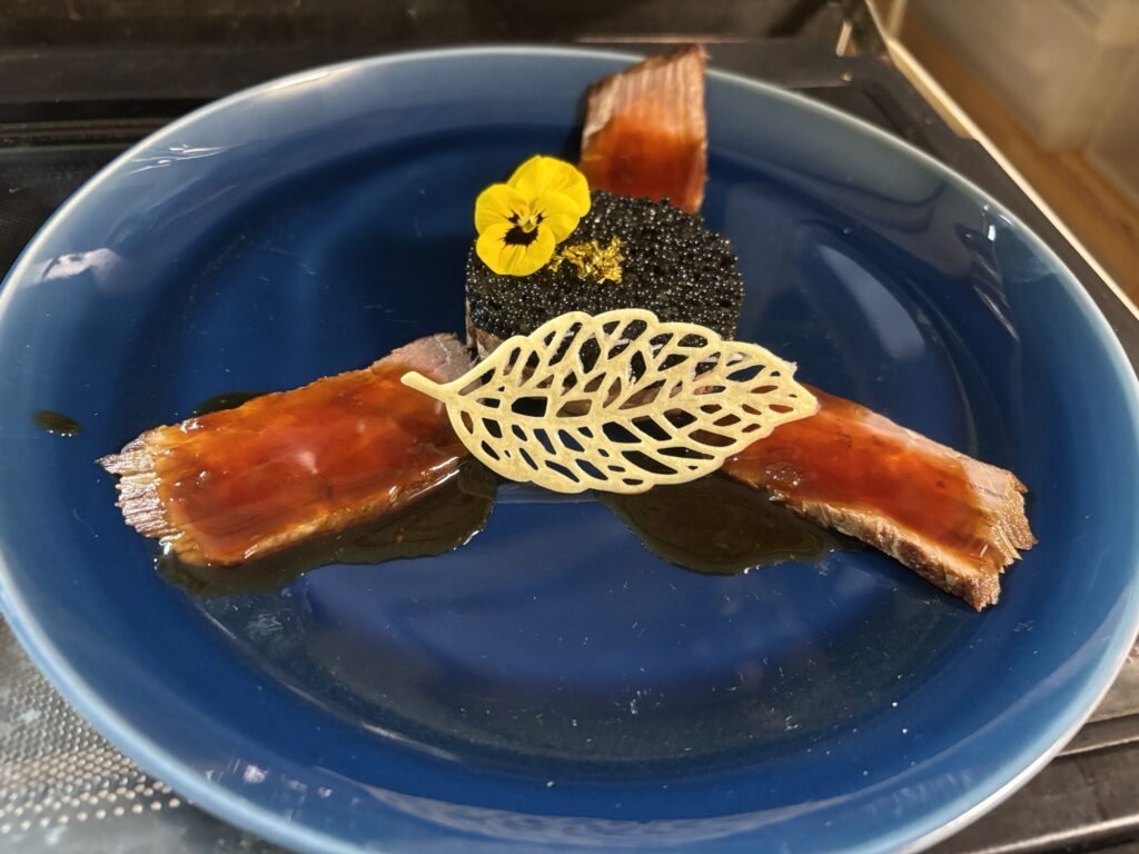ローストビーフを小さく切ったものにキャビア(正確にいうとランプフィシュ)をのせ、