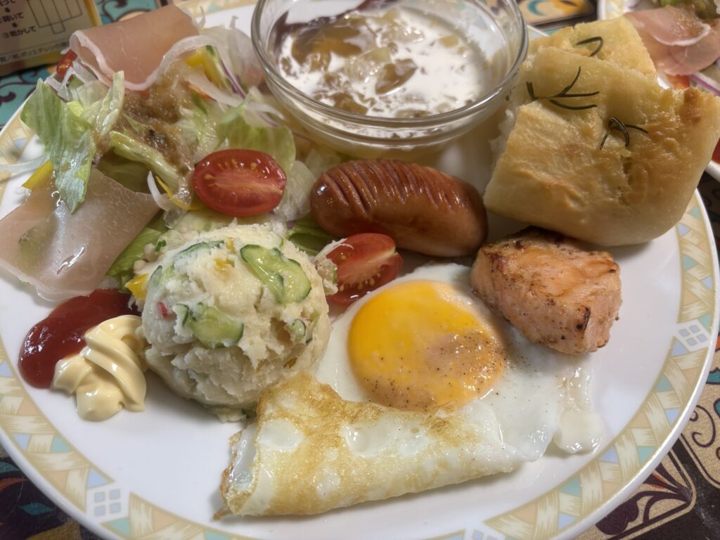 生野菜サラダ、生ハム、ポテトサラダ、目玉焼き、ウインナー、鮭の西京漬焼き、フォカッチャ、アールグレイと桃のゼリー。
