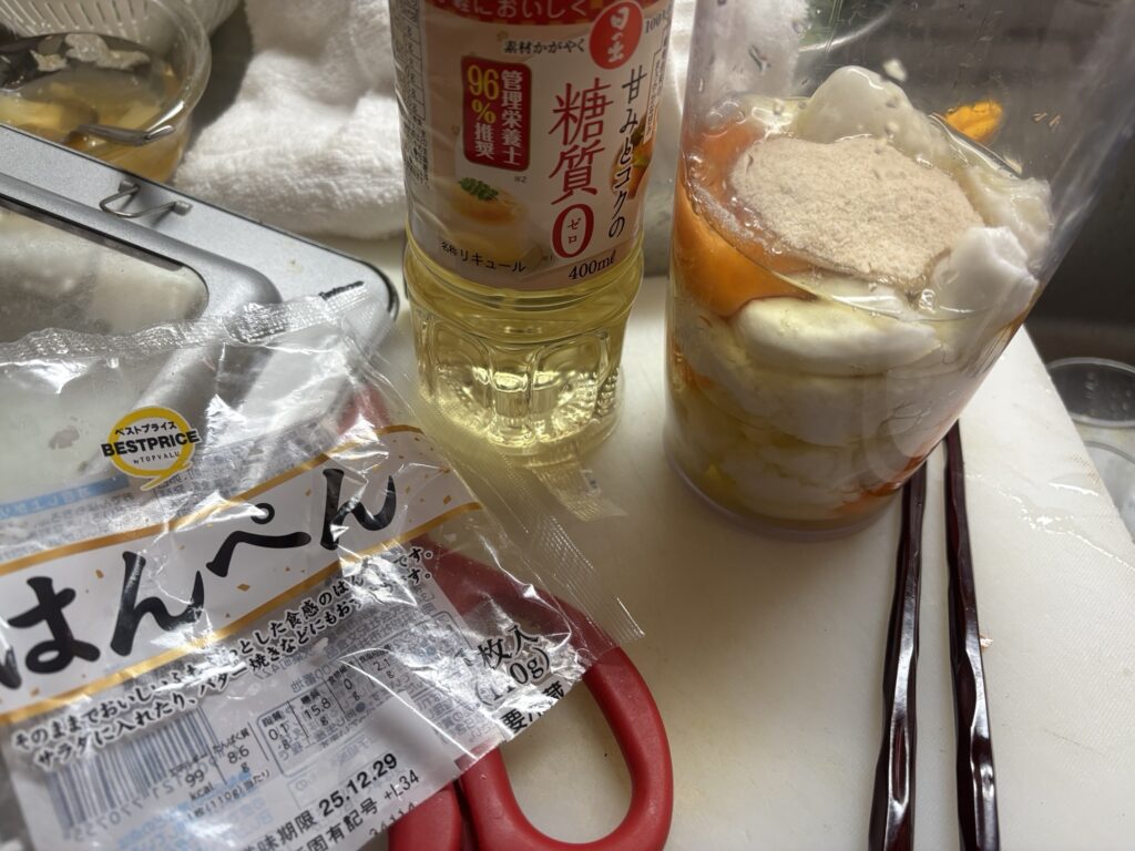 材料全部入れて、ブレンダーにかけて、卵焼き機で焼きました。