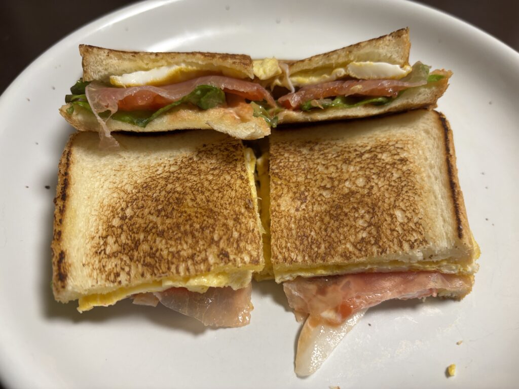 今日のお昼は、パンを買ってきて、残り物の野菜と卵でホットサンドイッチ。