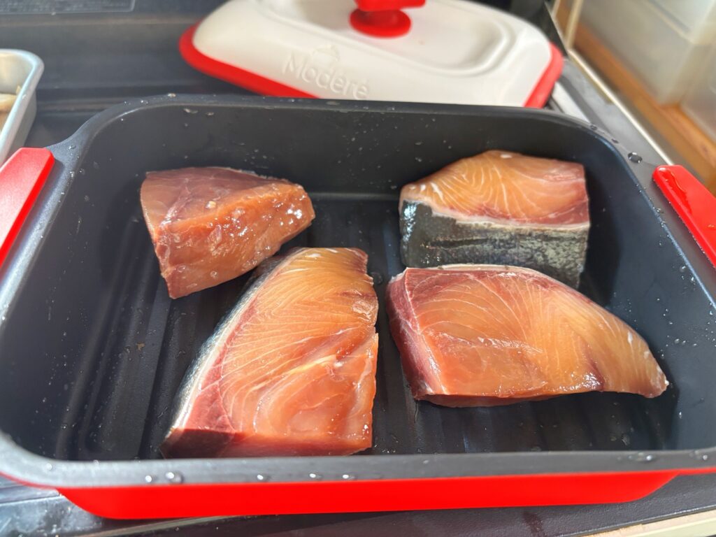 小さいさわらの西京味噌漬けは皮身2分、裏返して1.5分で焼き上がりました。