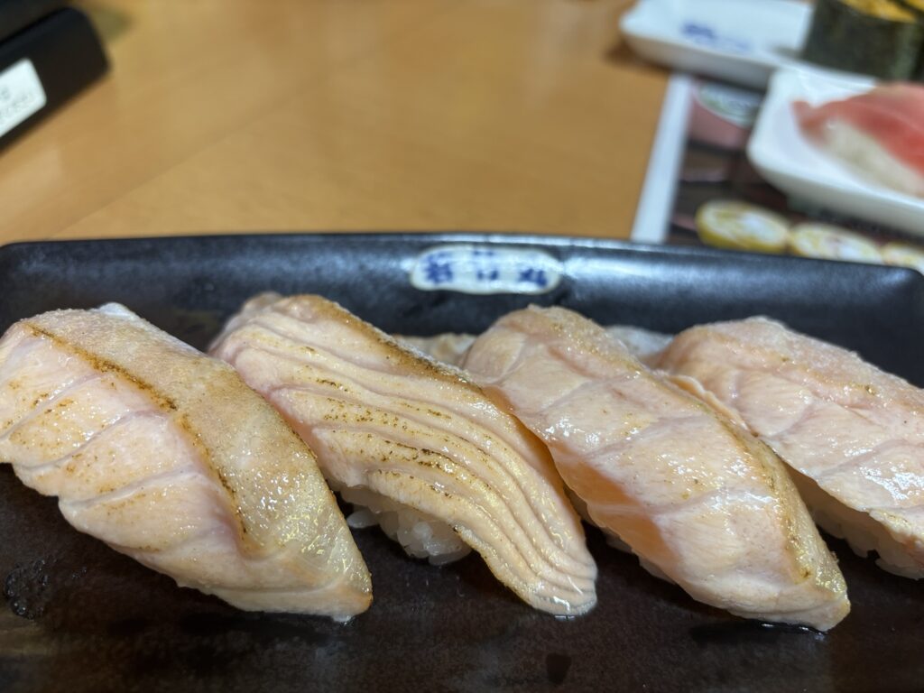 すんなり待たずに入れて、早速サーモンの炙り。