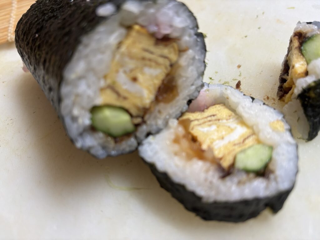 巻き寿司、昔は上手に巻けていたのにね、久しぶりに巻いたらへたっぴになってました。