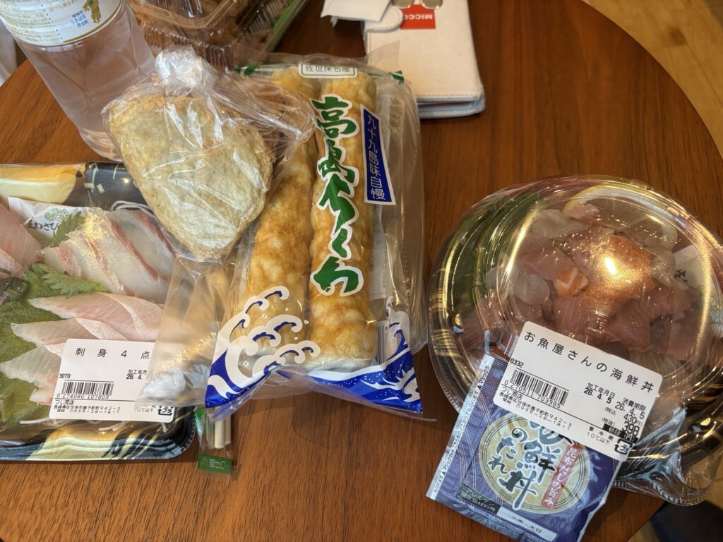 パールシーリゾートまで行って(歩いてすぐの距離)スーパーでお刺身とお弁当買ってきた。