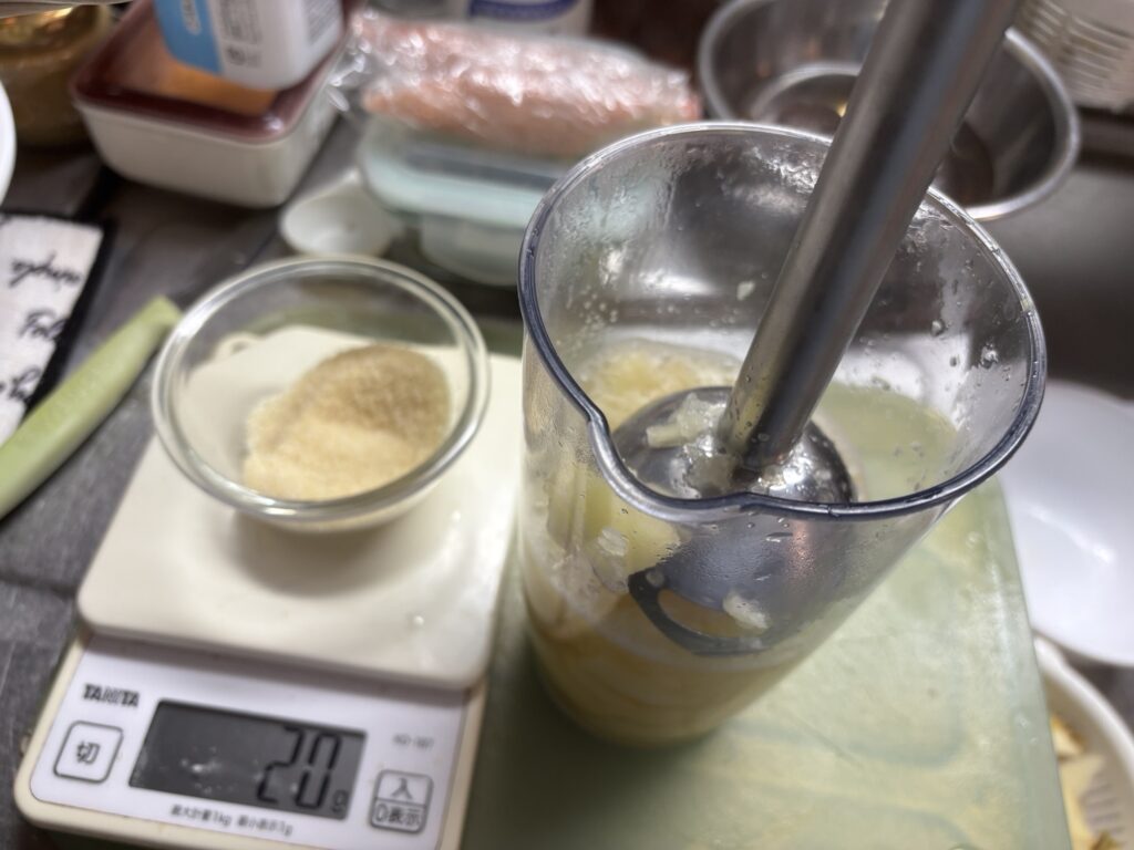 ペースト状になったらゼラチン20gを加えてよく混ぜます。