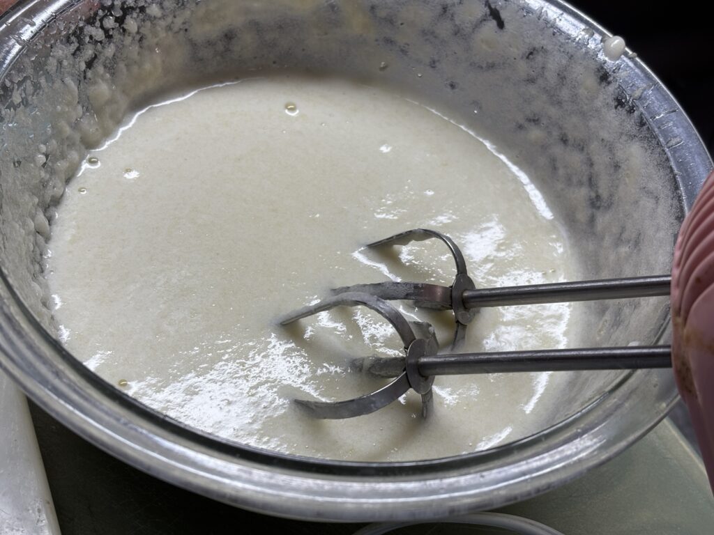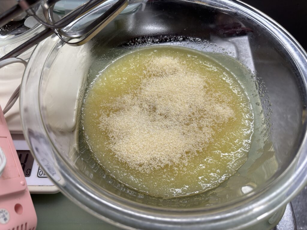 ここからが結構疲れるんだけど、泡立て器で、高速で10分、低速で10分くらい。ひたすら泡だてます。