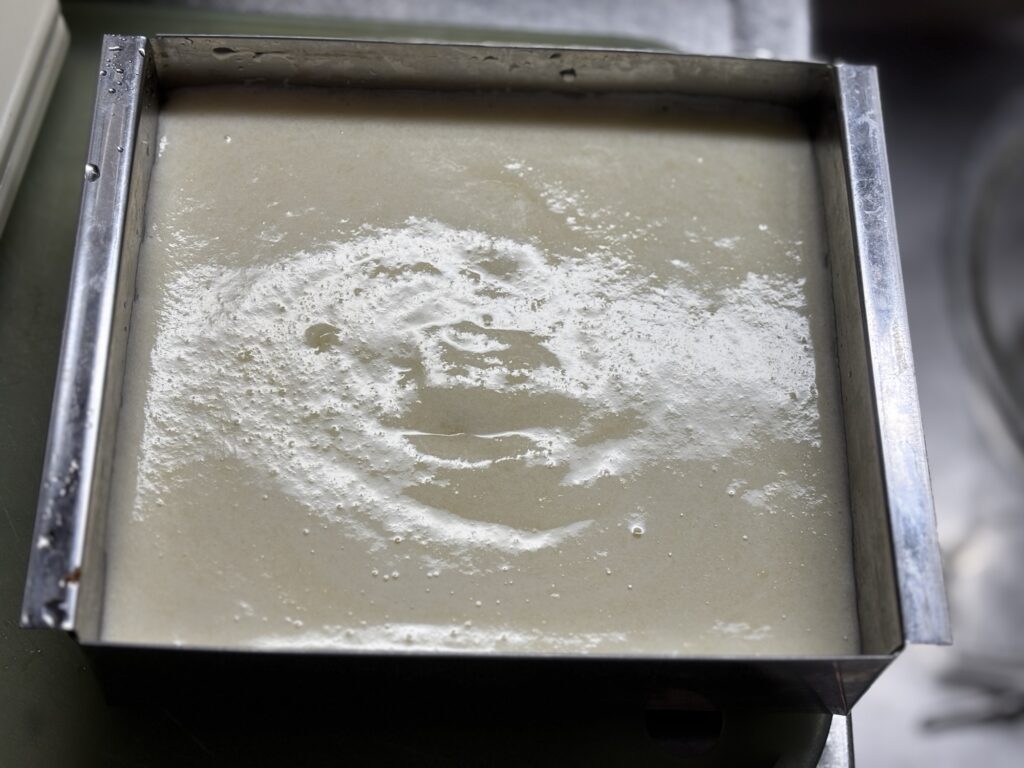 流し缶に入れて、平にならしたら冷蔵庫で冷やします。