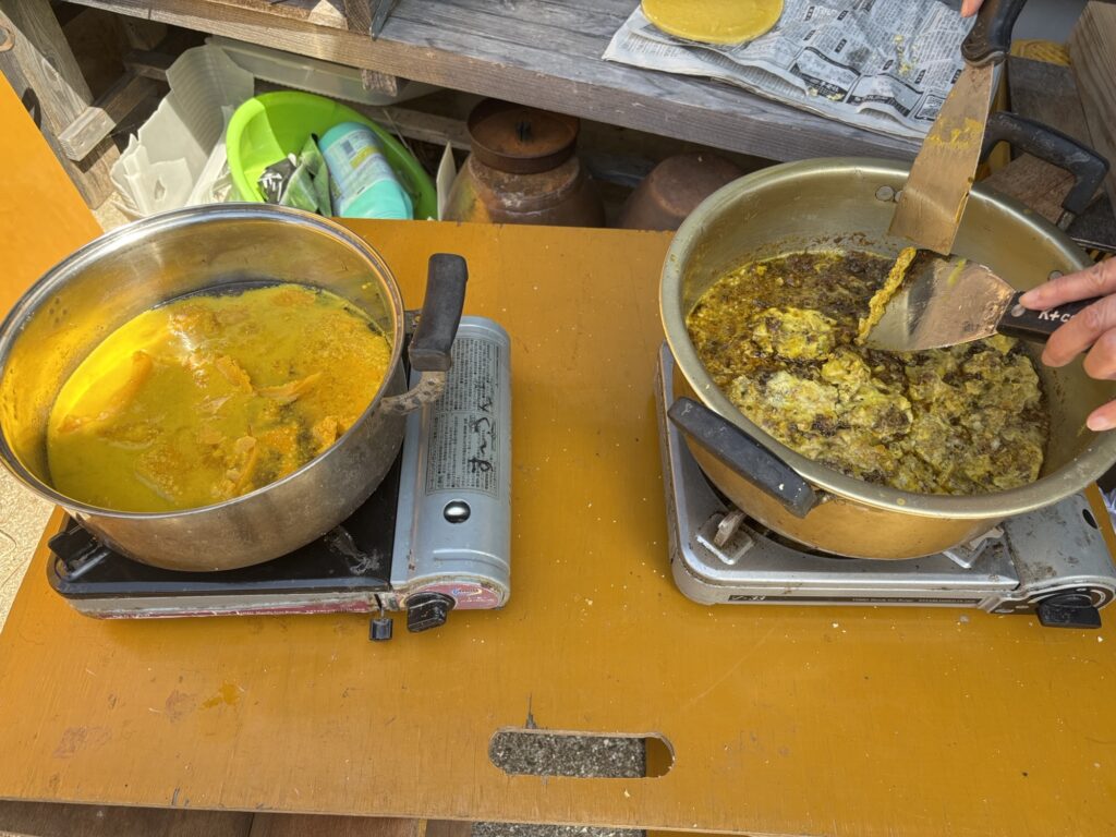 再度火にかけます。左が一度濾したもの。右は搾りかすを入れたばかりの鍋。