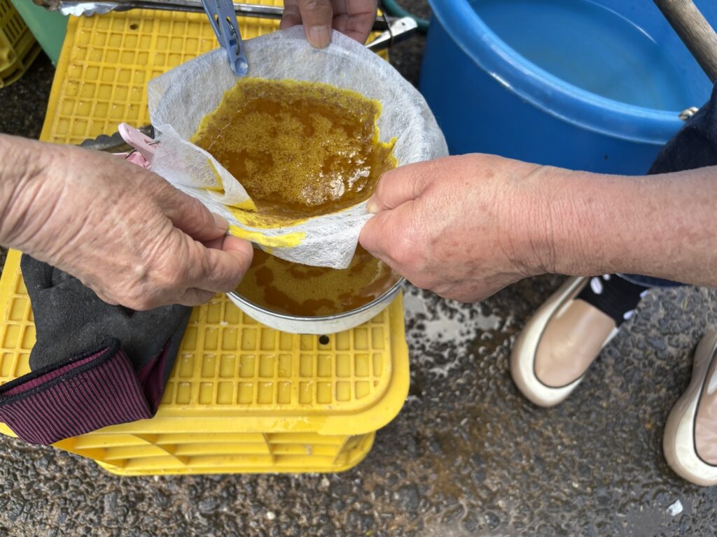 火からおろして冷ますと上に蜜が浮いてくるので、蜜だけを取って別の鍋に移して再度火にかけます。