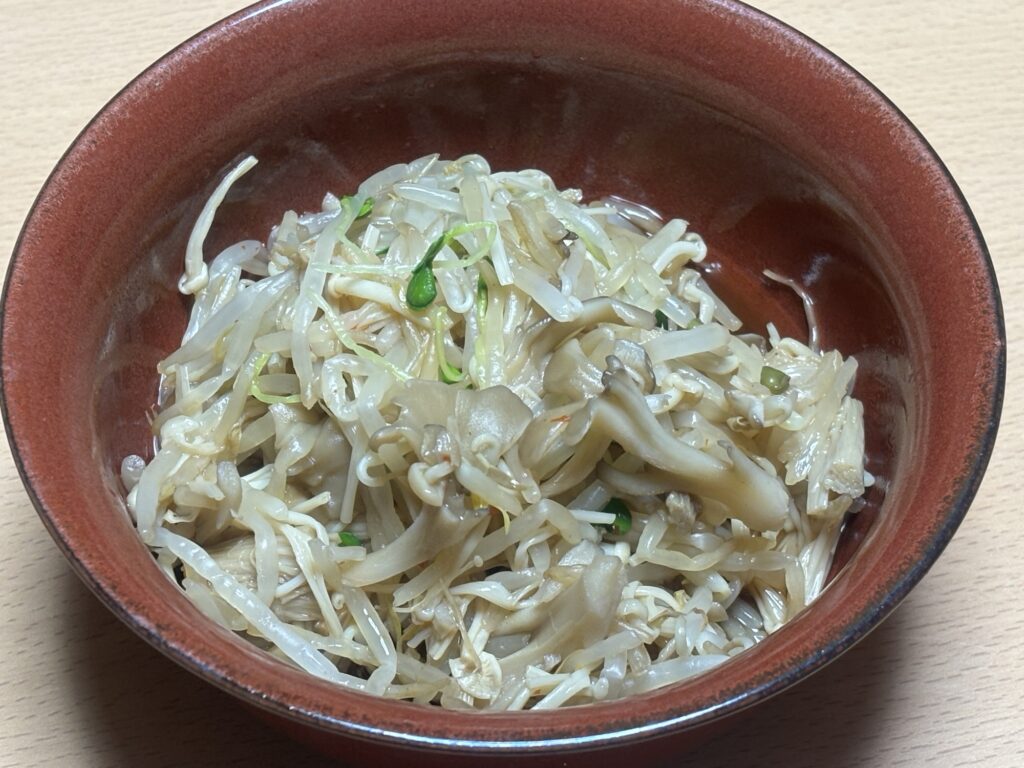 いつもながらの原価値段調整のためのもやしとキノコのピリ辛和え。