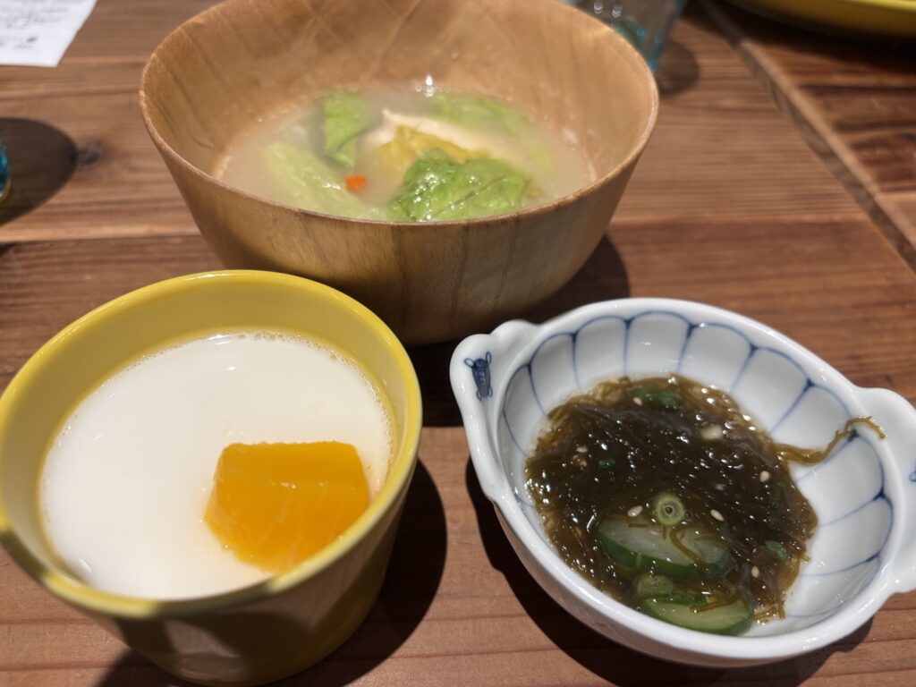 私はこれが美味しいよと聞いた、豆乳の薬膳風スープと、もずくの酢の物を追加して、