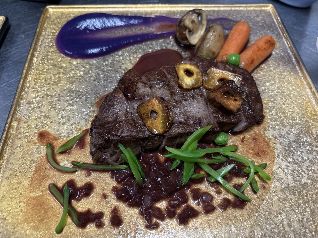 最後のステーキは、細長い皿に小さく盛る。肉は2種類用意して部位と焼き方を選ばせるようにする。